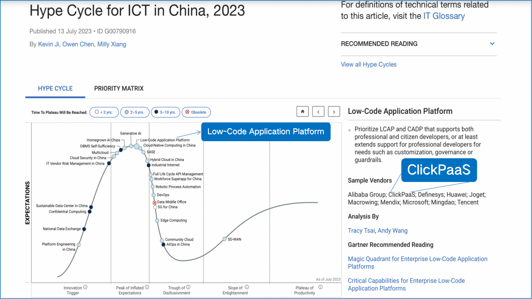 近日,国际权威研究机构Gartner发布了《Hype Cyple for ICT in China,2023(2023年中国ICT技术成熟度曲线)》报告,爱游戏平台凭借平台的aPaaS+iPaaS+DaaS保障业务系统的一站式设计,多租户、热发布、国际化、信创安全等特性实力登榜,并作为低代码PaaS平台代表厂商TOP2入选本次报告。