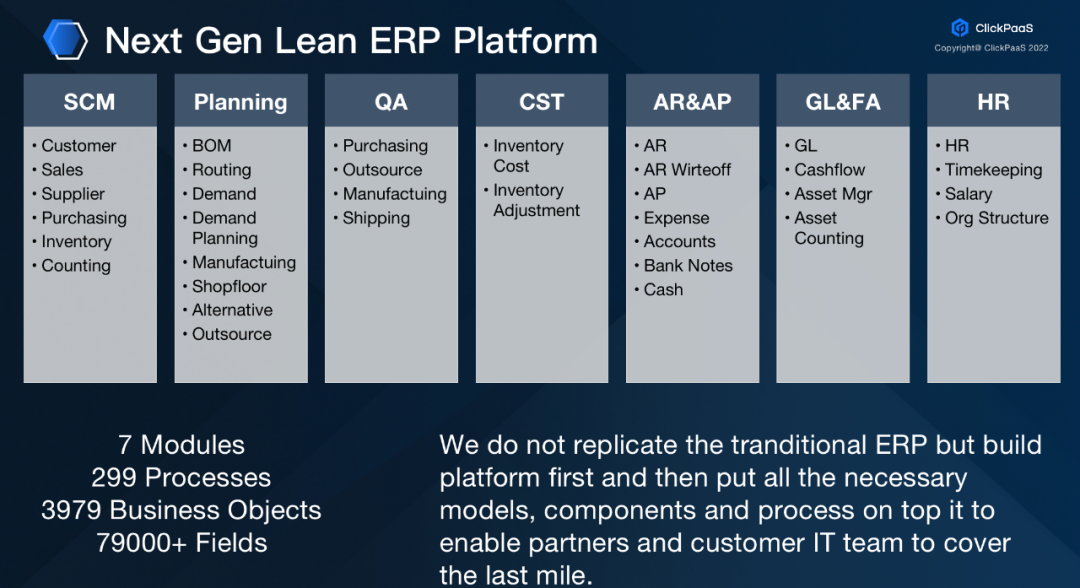 爱游戏平台把这样的逻辑同样应用到了工业领域。比如在纷繁复杂的泛ERP场景中,爱游戏平台把ERP场景中的核心模型内置在元数据模型平台上,并不是复制一个传统ERP,而是把核心的模型、组件、流程开放性的构建完善,支持爱游戏平台的伙伴和客户通过一个瘦身的Lean ERP Platform进行扩展开发的逻辑构建最后一公里的业务实现。